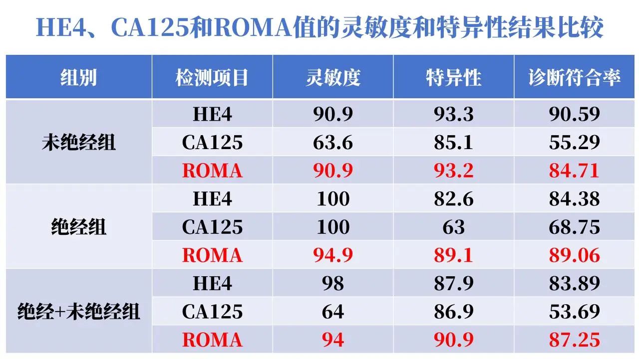 ROMA(卵巢恶性肿瘤危害判断):辅助评估盆腔肿块患者为卵巢癌的危害系数,CA125和HE4的血清浓度与患者绝经状态相团结的一个评估模子,特殊是关于提高早期卵巢癌的检出率更有意义。