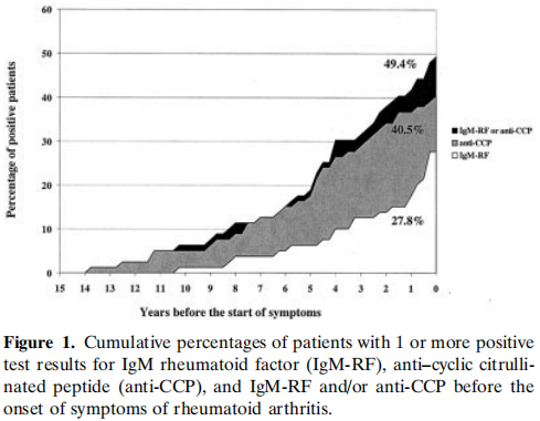 研究批注,Anti-CCP在患者首次RA症状泛起前的14年前即可在血清中被监测到,且具有一定的展望价值[2]。